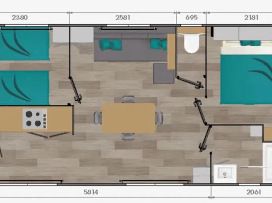 ESTRUCTURANúmero de dormitorios: 2 dormitoriosNúmero de WC/Duchas: 1 WC 1 DuchaRevestimiento: 2- PVCAislamiento: 4 estaciones